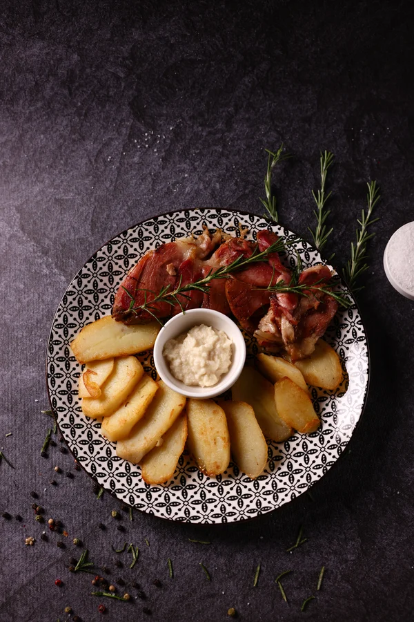 Butkica sporo kuvana u tamnom pivu, domaći zainjeni krompir