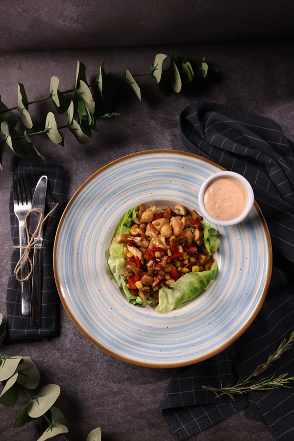 PIletina, šampinjoni, paprika, kukuruz, zelena salata, beli luk, Burger sos