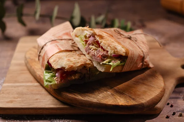 Domaća lepinja, tunjevina, luk, biljni sir, zelena salata, posni majonez, paradajz