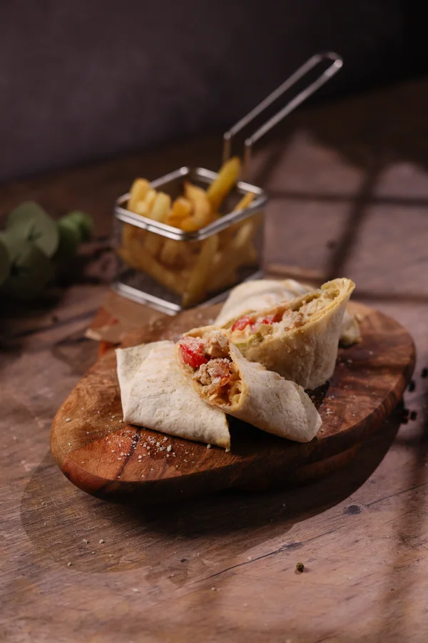 Piletina, slanina, cezar dresing, zelena salata, paradajz, pomfrit